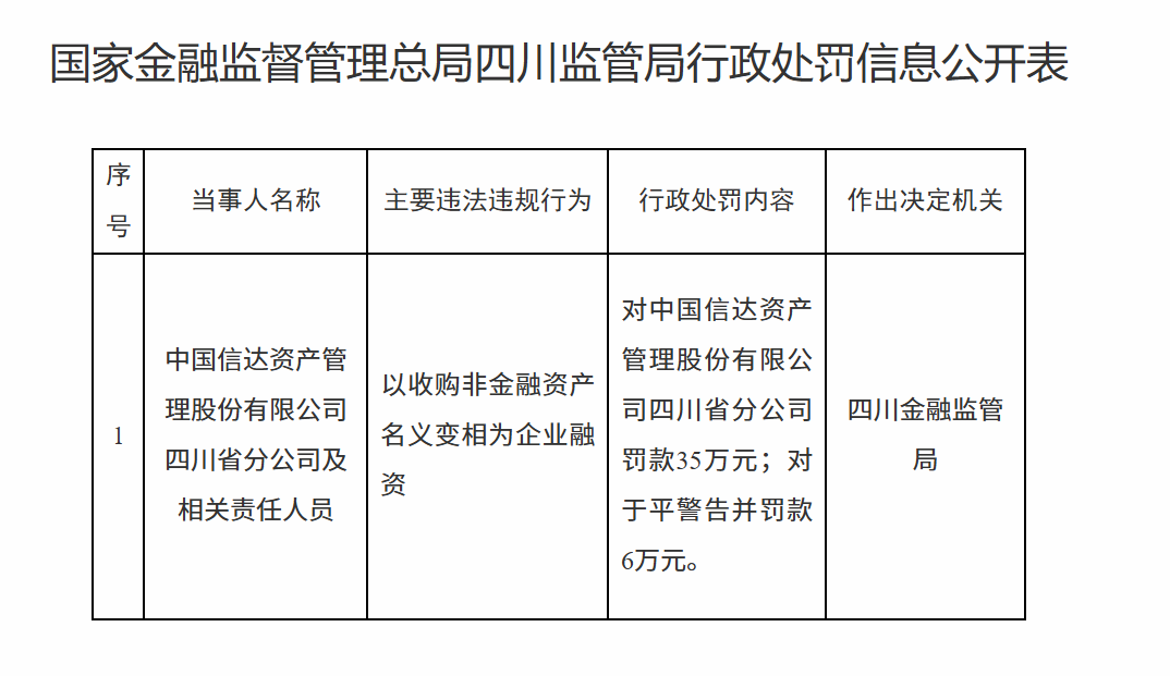 12月10日,国家金融监督管理总局四川监管局行政处罚信息公开表显示免费配资系统,中国信达资产管理股份有限公司四川省分公司及相关责任人员因以收购非金融资产名义变相为企业融资被罚款35万元;于某被警告并罚款6万元。